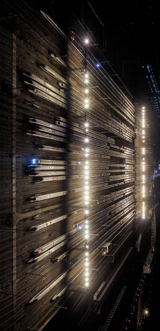 ▼今年春运期间,广州南高铁工务段整装待发的列车,摄影师@毕加思索(请横屏观看)