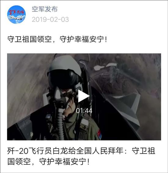 2018的最后一天,国防部官方微信号发布2019年空军招飞宣传片。此时的白龙,“头衔”已经变为了“空军歼20飞行员”。
