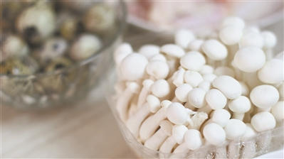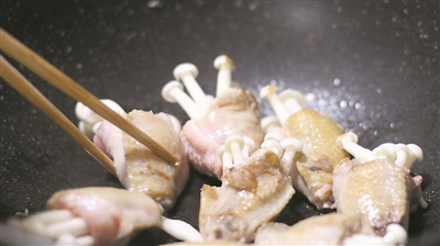 | 4.“酿”鸡翅 取腌入味的鸡翅,将一小束白菇塞进鸡翅中; |
