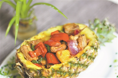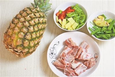 菠萝与排骨的结合在餐桌上不算新奇,但若加上有特色的菠萝容器,定能让人眼前一亮。