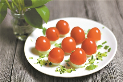 试试这一道“鸿运当头”吧,简单的材料,漂亮的造型,材料是常见的圣女果与鸡蛋,但颜值高、营养好。整道菜喜气洋洋,也不乏清新。餐桌上一眼望去,如同春天草地上可爱的小蘑菇,又如戴着小红帽的萌孩,“精气神”十足,定能收获亲戚家小朋友的芳心。