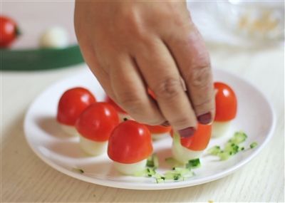 | 3.把鹌鹑蛋切去一点点,摆平在盘里,再将掏空的圣女果罩在上面,做成漂亮的小蘑菇; |