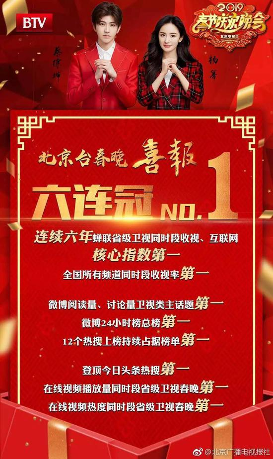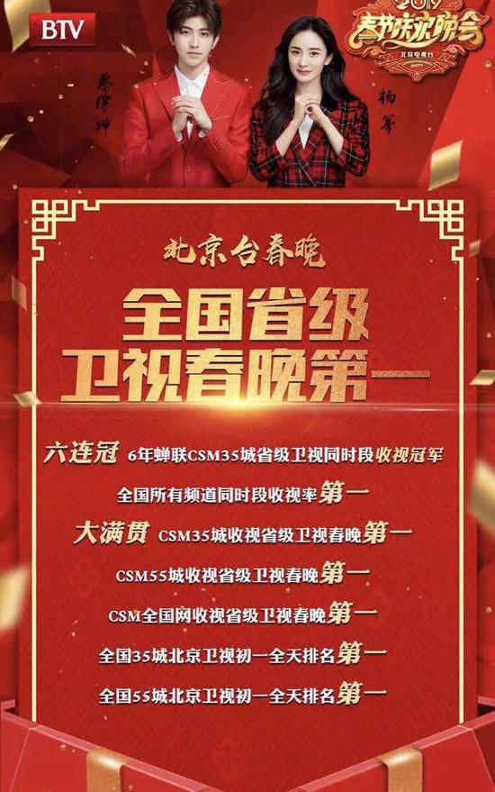 2019北京台春晚凭借优质内容、大美品质以及喜闻乐见的形式,赢得了广大电视观众和网民的一致好评,连续六年蝉联省级卫视同时段收视、互联网核心指数第一。