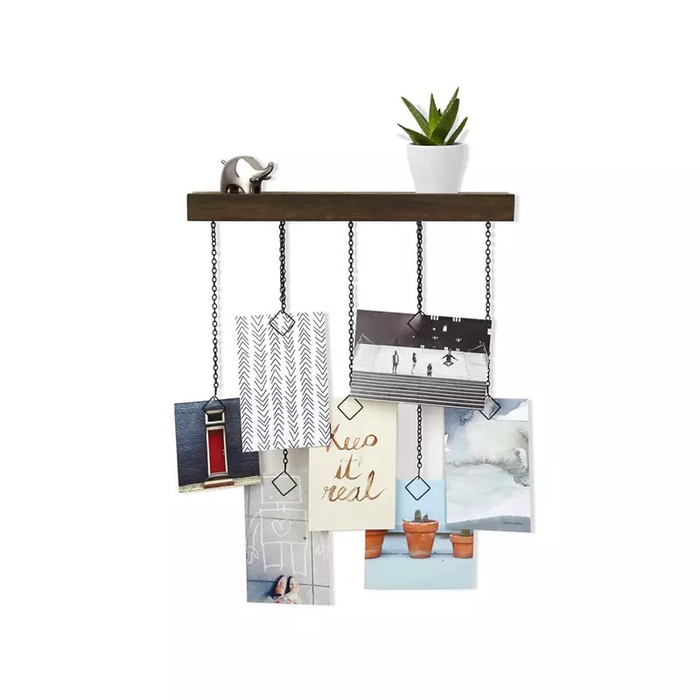 原生态木质的置物架,加上瀑布造型悬空设计长短不一的金属链条,虽然可以收纳的照片不多,但链条下方连接的方形夹子设计,可方便照片每段时间更换一次,保持照片墙的新鲜感。置物架的设计增加了实用功能,放置在玄关的走廊处,进门时可以将钥匙、钱包等小物品放在上面。层次分明的创意构思,配上充满美感的照片,推开大门,照片墙这一小细节一定让人眼前一亮。