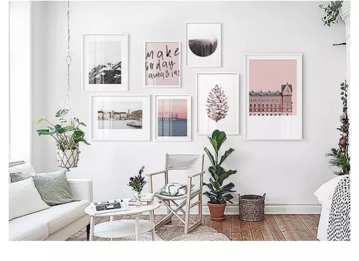 家中沙发后面墙上的空间可以充分利用起来,一个大的相框占据一面墙显得单调又死板。多个大小不一的相框,随意地摆放组合,或拼成心形、圆形等简单的形状,会显得富有趣味。里面可以放上自己拍的美丽风景,也可以放上一张全家福。相框的质地可以根据自己家的风格来选择,新中式风格可以选择深色的木质相框,北欧风格则可以选择原木色或白色的相框,而现代风格则可以选择金色金属质地的相框。