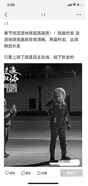 2月8日上午,北青报记者调查发现,上映第四天,网上已有不少卖家在叫卖《流浪地球》影片资源,声称是“高清完整版”,售价低至1元。