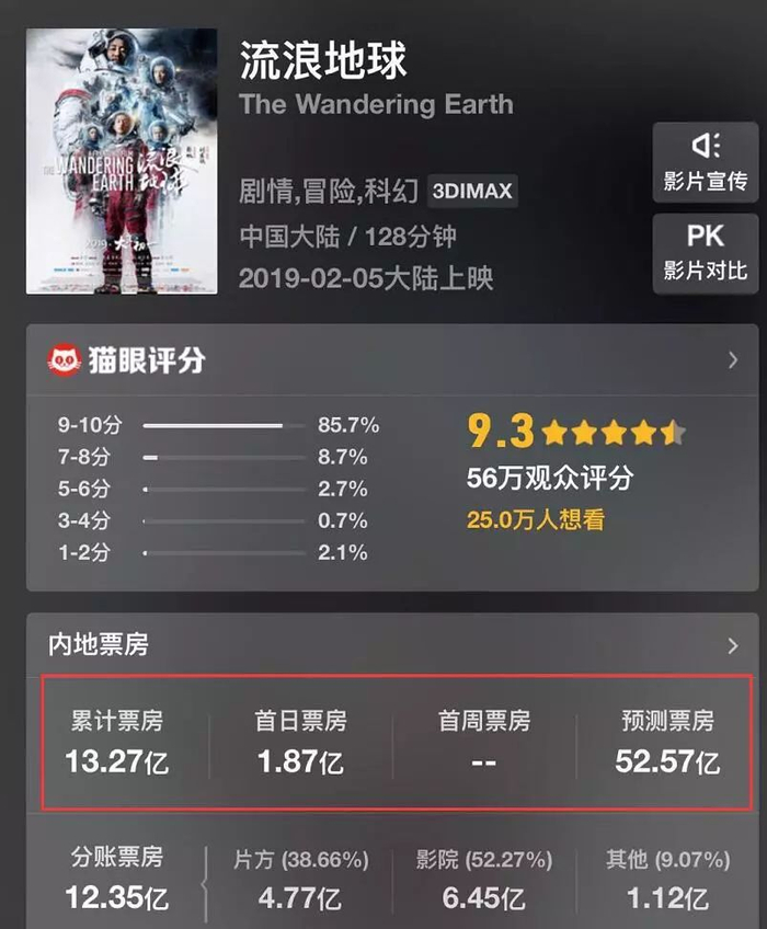 带着“贺岁档”“国产科幻片”“刘慈欣”等标签,电影《流浪地球》大年初一上映后口碑、票房双丰收。有人称之为中国科幻电影的里程碑作品,截止9日发稿,票房已破13亿。预计国内最终票房52.5亿。