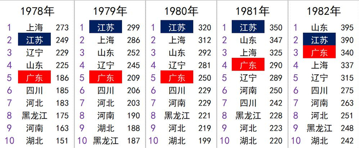 到1982年,极具戏剧性的一幕出现:山东赶超江苏成为老大,广东从第5,一步一个脚印,爬升到了第3。