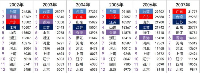 之后,对于广东来说,“对手”已经不在大陆了。在2003年,广东超越香港,4年之后又把台湾抛在了身后。