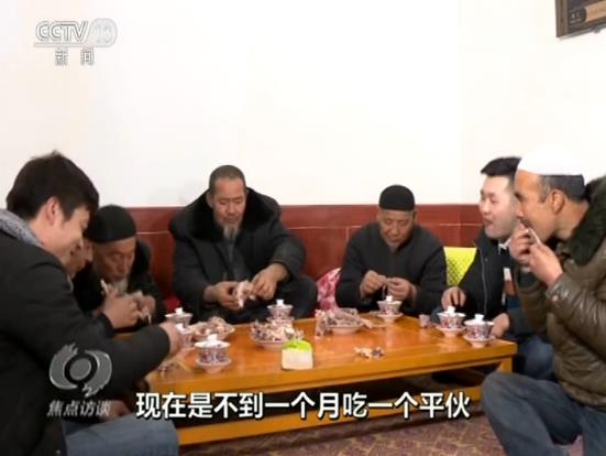 吃平伙是东乡族老百姓的一个传统,就是大家买一只羊,平摊价格以后搭伙吃羊肉。过去,只有家里娶媳妇、盖房子这样的大事,才能吃个平伙。现在生活好了,家里请客的时候也吃平伙,今天,马麦志要请客,不用大家出份子钱了。他说大儿子在外面打工,自己在干清洁工,媳妇在车间里面炸油馃馃,收入应该有3万多元。
