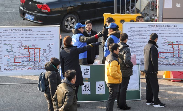 记者注意到,尽管提前很久就进行了宣传通告,不过在停运首个工作日还是有部分乘客不清楚停运信息。其中,最常见的情况就是以为13号线是单方向停运, “我看上面说的东直门到龙泽停运,还以为是单向停运。” 今天早上8点15左右,地铁工作人员帮助多位市民规划新的换乘路线,现场工作人员提醒市民,地铁13号线的停运路段为东直门站至龙泽站双方向,乘客可提前登录北京地铁官网查询绕行信息。