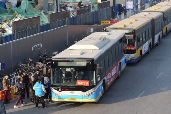 今天(2月11日)上午记者乘坐北京地铁13号线时发现,站内外引导有序,并没有出现旅客大面积排队的现象。在龙泽地铁站的站外,北京公交客一分公司还增开了前往地铁回龙观站的摆渡车。