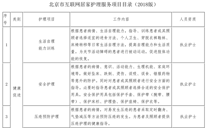 安全、必要、有效、医疗风险低、易操作实施、消毒隔离达标、不易发生不良反应为服务原则,经专家论证,北京制定了《北京市互联网居家护理服务项目目录(2018版)》。记者注意到,其中列入了肌肉注射、皮下注射、导尿管留置更换、压疮护理等需求量较大的服务,也有母婴护理、灌肠、生活自理能力训练等内容。