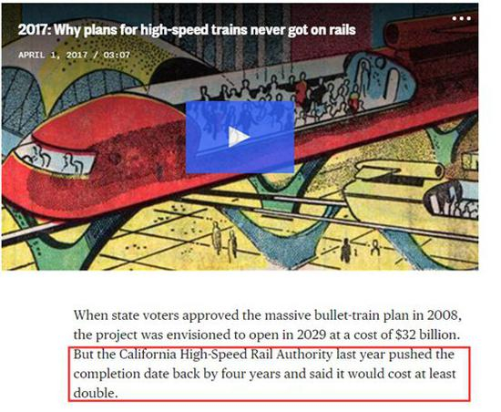 美国NBC新闻网的报道就指出,当年加州政府提出这个项目的时候,给出的承诺是项目会在2029年完工且只会耗资320亿美元,可去年官方给出的最新数据却显示项目的完工日期会延后4年,而成本更是至少翻了一倍之多。