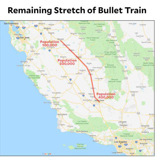 当然,这一举动在不少关心加州高铁项目的人看来,和完全废掉没什么区别。美国独立新闻网站MotherJones.com的一篇文章就认为保留这177公里的高铁简直是“失了智”,因为这段长度开车只要2个半小时,而且沿线的三个小城镇的人口合一起也才一百万人,与项目原本打算覆盖的1000万-1500万人的规模相去甚远,所以即便完成了前景也将异常暗淡。