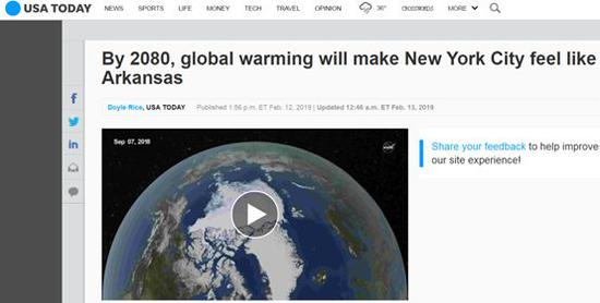这不,在过去这个冬季,美国多个城市就遭遇了史上最严重的寒潮。《今日美国》最新的一篇报道就引用国际知名科研期刊《自然》的一份报告警告说,如果气候变化还得不到遏制,那么在2080年的时候,地处美国东北的纽约就将感受到中南部炎热的阿肯色州的气候。