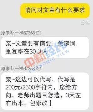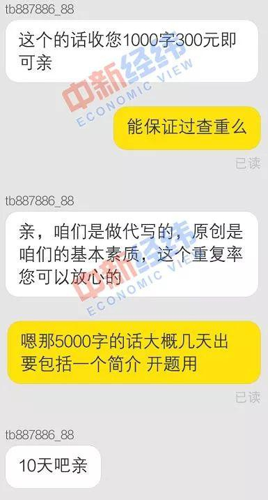 对于上述服务的价格,中新经纬询问了几个代写论文的商家,其中一商家表示,本科文科中文论文每千字300元左右,5000字论文10天即可出稿;英文论文则售价相对较高,每千字达900元左右。上述商家的一位客服人员称,代写价格通常与总字数、专业和相应学位有关。当被问及文章重复率时,该商家表示“原创是我们的基本素质”。