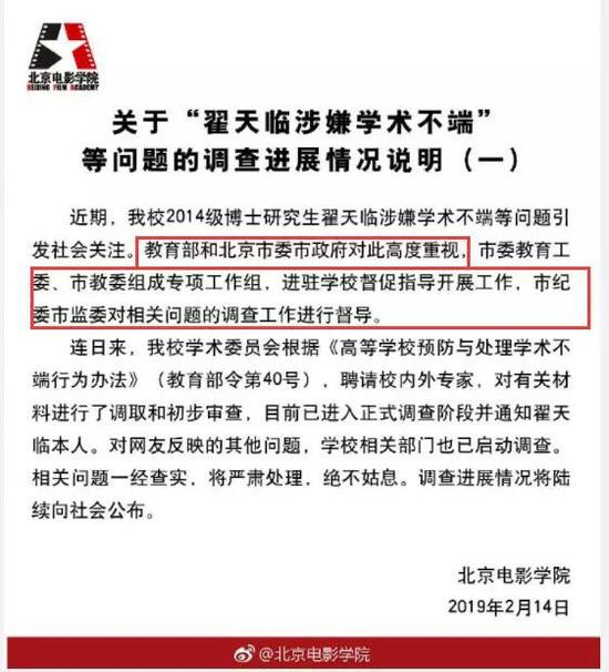 近期,北京电影学院2014级博士研究生翟天临涉嫌学术不端等问题引发社会关注。教育部和北京市委市政府对此高度重视,北京市委教育工委、北京市教委组成专项工作组,进驻学校督促指导开展工作,北京市纪委市监委对相关问题的调查工作进行督导。连日来,北京电影学院学术委员会根据 《高等学校预防与处理学术不端行为办法》 (教育部令第 40 号),聘请校内外专家,对有关材料进行了调取和初步审查,目前已进入正式调查阶段并通知翟天临本人。