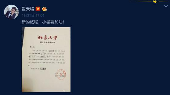 2019年1月31日,翟天临在微博上晒出北京大学博士后录用通知书,并配文说:“新的旅程,小翟要加油!”随即,有关翟天临“被录用为北大博士后”的话题就上了微博热搜。