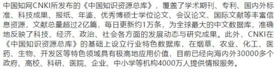 此外,CNKI在《中国知识资源总库》的基础上设立行业特色数据库,在烟草、农业、化工、医药、生物、开发区等特色领域具有极高地应用价值,目前已经向海内外30000多个政府、高校、科研、医院、企业、中小学等机构4000万人提供情报服务。