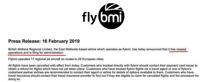 2月16日,英伦航空(Flybmi)宣布停运和破产,所有航班从当日开始全部取消。这是2019年以来第二家宣布破产的欧洲航司。