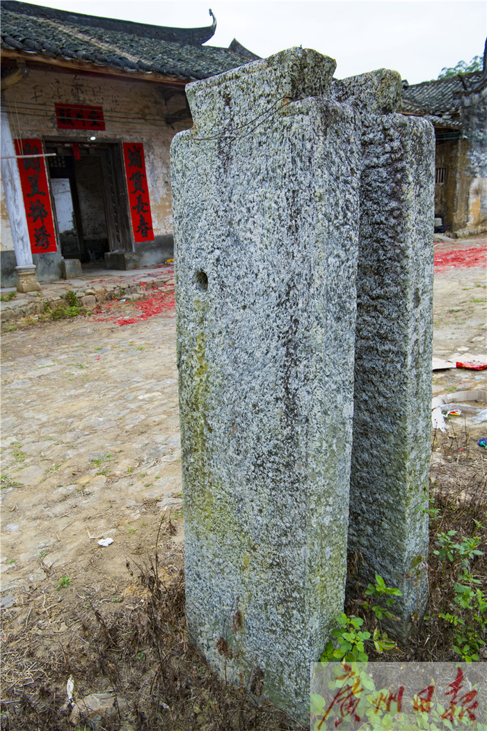记者注意到,屋带以后面正中部房间为最高,屋脊为灰塑龙船脊,屋带以后正面正中部房间为中心,屋面绕左右向前延伸依次降低,直绕至围垄屋的正面,以砖砌镬耳封火山墙为正面墙,耸立两侧,并与祠堂前墙、大门组成一组天际线变化丰富的大立面,整个村落为前方后圆的围垄屋格局。在岗埔围垄屋外平地上有两对旗杆夹,村民称其为“秀才碑”,围垄屋每出一名秀才,就竖起一对旗杆夹。“我们这座围垄屋出了38名秀才!”村民说。