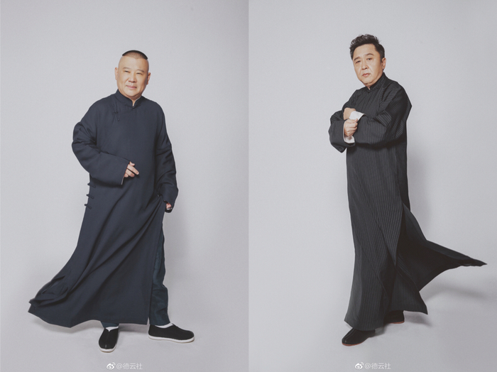 少班主郭麒麟和阎鹤祥这一对儿选择了同样的站姿,只不过长衫的颜色一深一浅,同为素雅,一个清淡一个深沉。