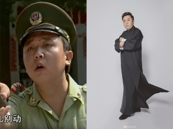 同色系着装出镜的于谦选择了带暗条纹的长衫,这样与郭德纲既搭配又不至于雷同。于谦早在当年热播的电视剧《编辑部的故事》中就客串了一个警察,那时候刚刚20出头的于老师除了脸上的胶原蛋白多一些,也没有给人太多“岁月是把杀猪刀”的感叹,可见颜值经得起岁月的考验。