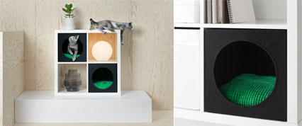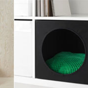 把储物柜变成猫的家,盒状猫窝柔软安全,可以完美嵌入柜中,这样的搭配节省了地面空间,同时也给宠物带来安全感。