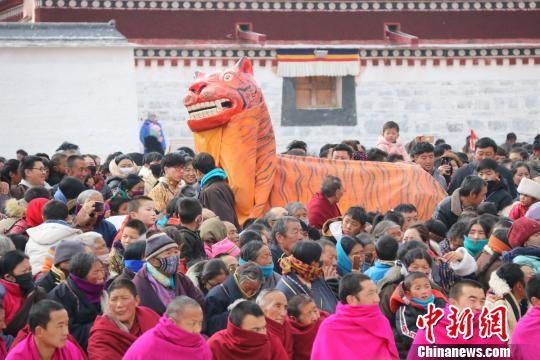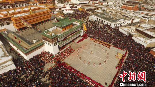 中新网兰州2月19日电 (纪赟 陶晓琦)佛乐悠扬、法鼓铿锵,2月18日农历正月十四,被誉为“世界藏学府”的拉卜楞寺举行一年一度的正月法舞法会,祈愿新的一年吉祥如意,约四万多名僧俗信众和游客参加了活动。