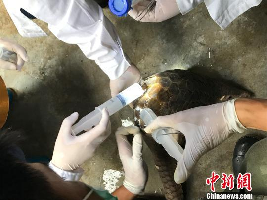 图为广西林业局专家对穿山甲进行体外寄生虫驱虫处理。资料图 广西林业局供图