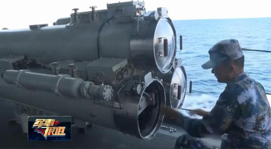 声呐系统发现可疑水下目标后迅速上报,各舰艇锁定目标,模拟发射鱼雷,成功击中目标。