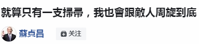 综合台湾“东森新闻网”等媒体2月24日报道,苏贞昌22日在“立法院”声称,“若两岸开打,届时给我一支扫帚我都跟他拼”引起岛内争议↓