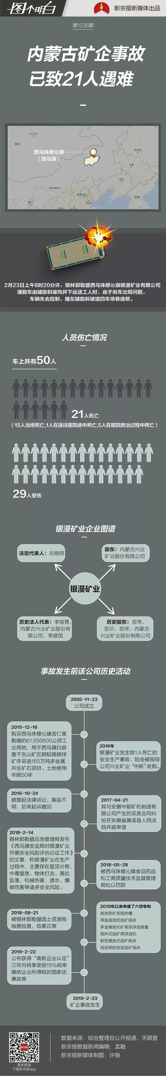 昨日 (2月23日),内蒙古锡林郭勒盟西乌旗银漫矿业公司运送工人下井车辆发生事故,致20死30伤。新京报记者今日(2月24日)从锡林郭勒盟委宣传部获悉,事故死亡人数升至21人,内蒙古自治区已成立事故调查组,并派出两批医疗专家组赴当地救治伤员。