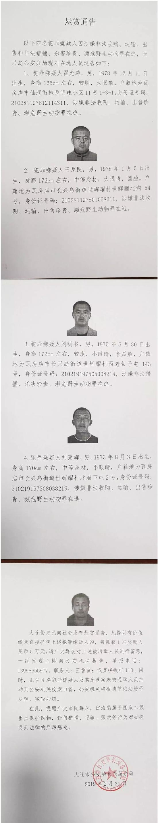 2月25日上午,大连警方悬赏20万元通缉4名涉案嫌疑人: