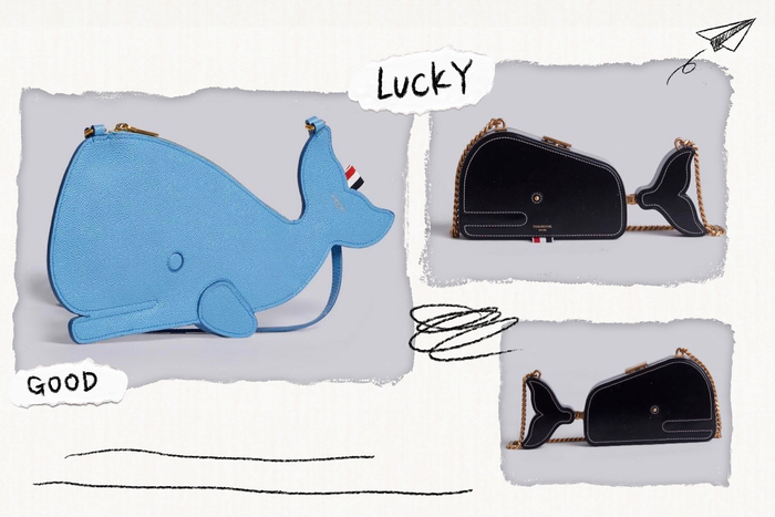 淡蓝色的鲸鱼造型是很少见的包款。Thom Browne推出了挎包和搭链手拿包两款。其中,手拿包采用了搭链肩带,配顶置夹扣以及可塑形的鲸鱼小尾巴,整个造型栩栩如生。