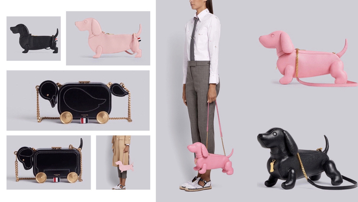 Thom Browne的动物包风格可酷可萌。很少见的狗狗造型的男士手提包,采用了卵石纹牛皮,配顶置手柄,黄铜的小狗骨头吊饰是点睛之笔。