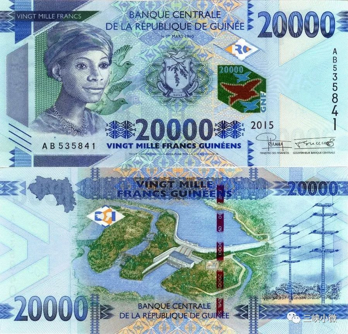 ▲几内亚20000几内亚法郎纸币上的地标,凯乐塔水利枢纽。