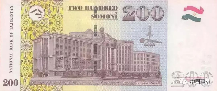 ▲塔吉克斯坦200索莫尼纸币上的地标,塔吉克斯坦国家图书馆。