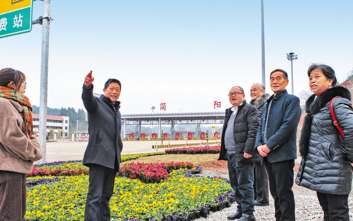 在成安渝高速公路石钟连接线,简阳民强村党总支书记张祥(左二)对市民代表讲述这条路给村里黄花产业带来的实惠
