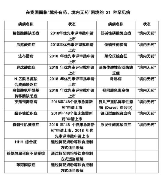另有包括苯丙酮尿症在内的3种罕见病可以通过特配奶粉等饮食控制方式适当缓解。但仍有包括镰刀型细胞贫血病等在内的9种罕见病的患者在“境内无药”的困境中等待希望。