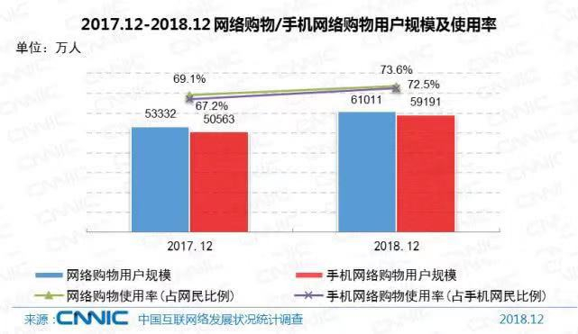 截至2018年12月,我国网络购物用户规模达6.10亿,较2017年底增长14.4%,占网民整体比例达73.6%。手机网络购物用户规模达5.92亿,较2017年底增长17.1%,使用比例达72.5%。