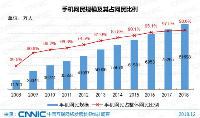 2月28日,互联网络信息中心(CNNIC)发布了第43次《中国互联网络发展状况统计报告》,截至2018年12月,我国网民规模为8.29亿,全年新增网民5653万,互联网普及率达59.6%,较2017年底提升3.8个百分点。手机网民规模达8.17亿,全年新增手机网民6433万;使用手机上网的比例由2017年底的97.5%提升至2018年底的98.6%。