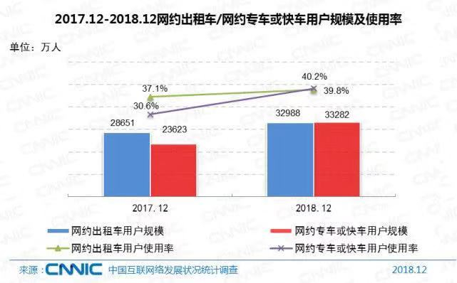 截至2018年12月,我国网约出租车用户规模达3.30亿,较2017年底增加4337万,增长率为15.1%。网约专车或快车用户规模达3.33亿,增长率为40.9%,用户使用比例由30.6%提升至40.2%。