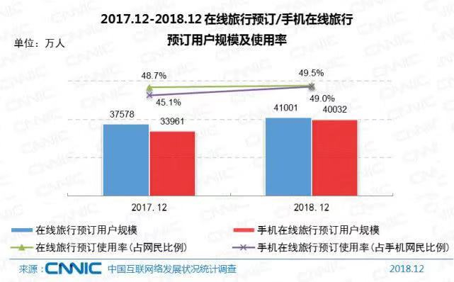 截至2018年12月,在线旅行预订用户规模达4.10亿,较2017年底增长3423万,增长率为9.1%;网上预订机票、酒店、火车票和旅游度假产品的网民比例分别为27.5%、30.3%、42.7%和14.5%。其中,预订旅游度假产品的用户规模增速最快,增长率为35.5%。