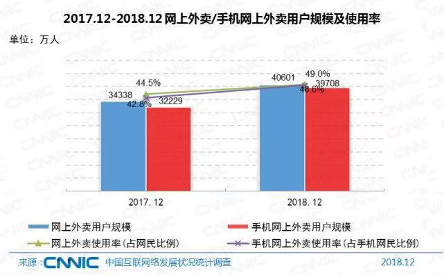 截至2018年12月,我国网上外卖用户规模达4.06亿,较2017年底增长18.2%,继续保持较高增速。手机网上外卖用户规模达3.97亿,增长率为23.2%,使用比例达48.6%。