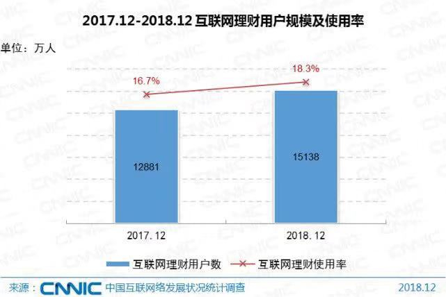 截至2018年12月,我国购买互联网理财产品的网民规模达1.51亿,同比增长17.5 %,网民使用率为18.3%。