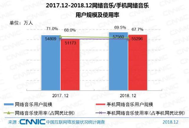 截至2018年12月,网络音乐用户规模达5.76亿,较2017年底增加2751万,占网民总体的69.5%。手机网络音乐用户规模达5.53亿,较2017年底增加4123万,占手机网民的67.7%。