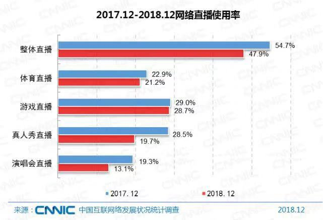截至2018年12月,网络直播用户规模达3.97亿,较2017年底减少2533万,用户使用率为47.9%,较2017年底下降6.8个百分点。从体育、游戏、真人秀、演唱会四个细分内容领域来看,游戏直播用户使用率基本稳定,体育直播用户使用率略有下降,演唱会、真人秀直播用户使用率分别下降6.2、8.8个百分点。