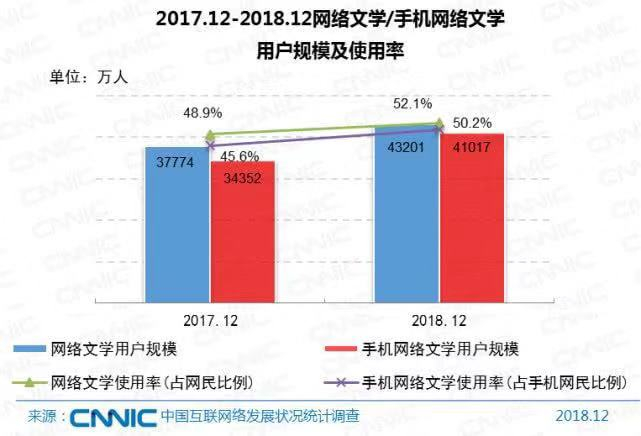 截至2018年12月,网络文学用户规模达4.32亿,较2017年底增加5427万,占网民总体的52.1%。手机网络文学用户规模达4.10亿,较2017年底增加6666万,占手机网民的50.2%。